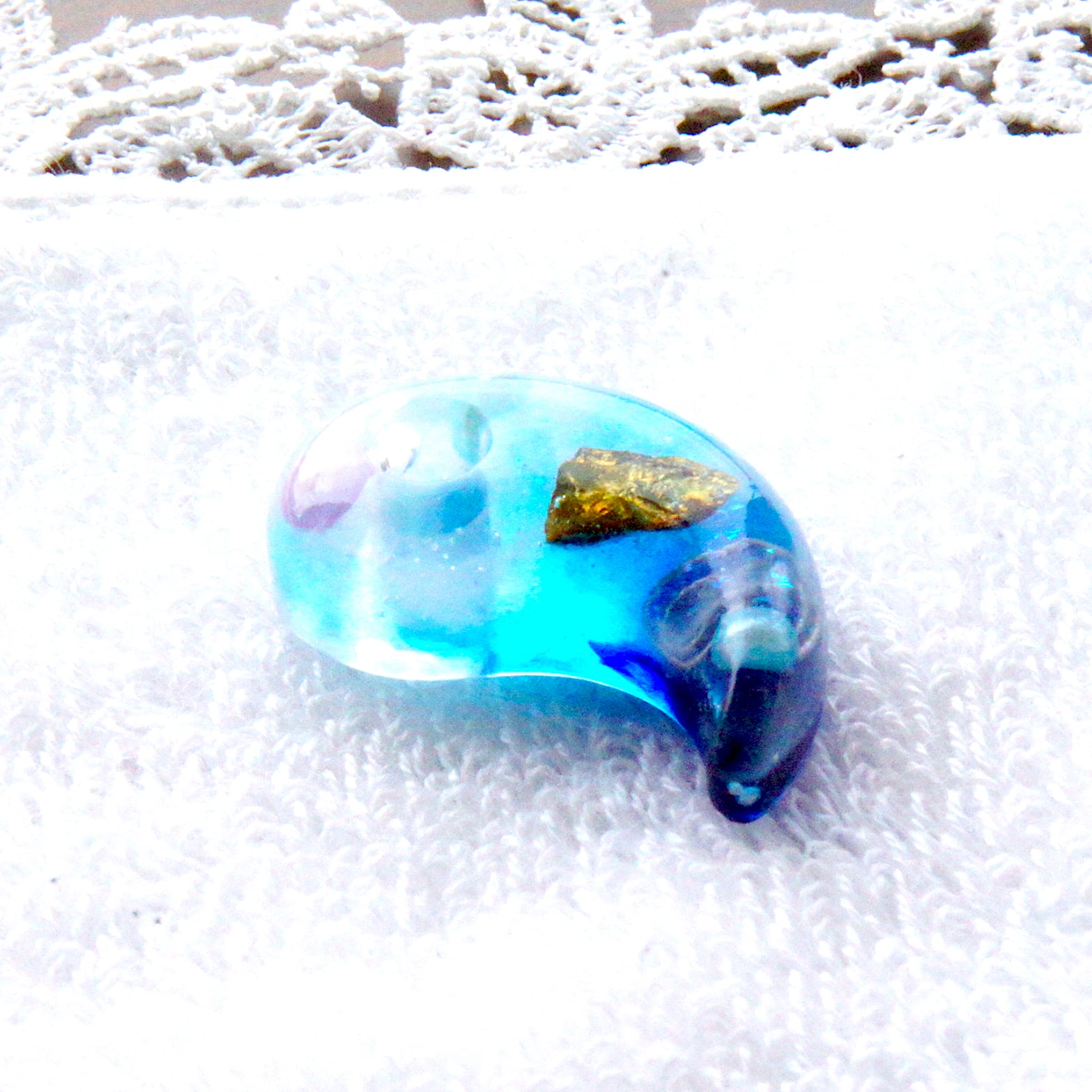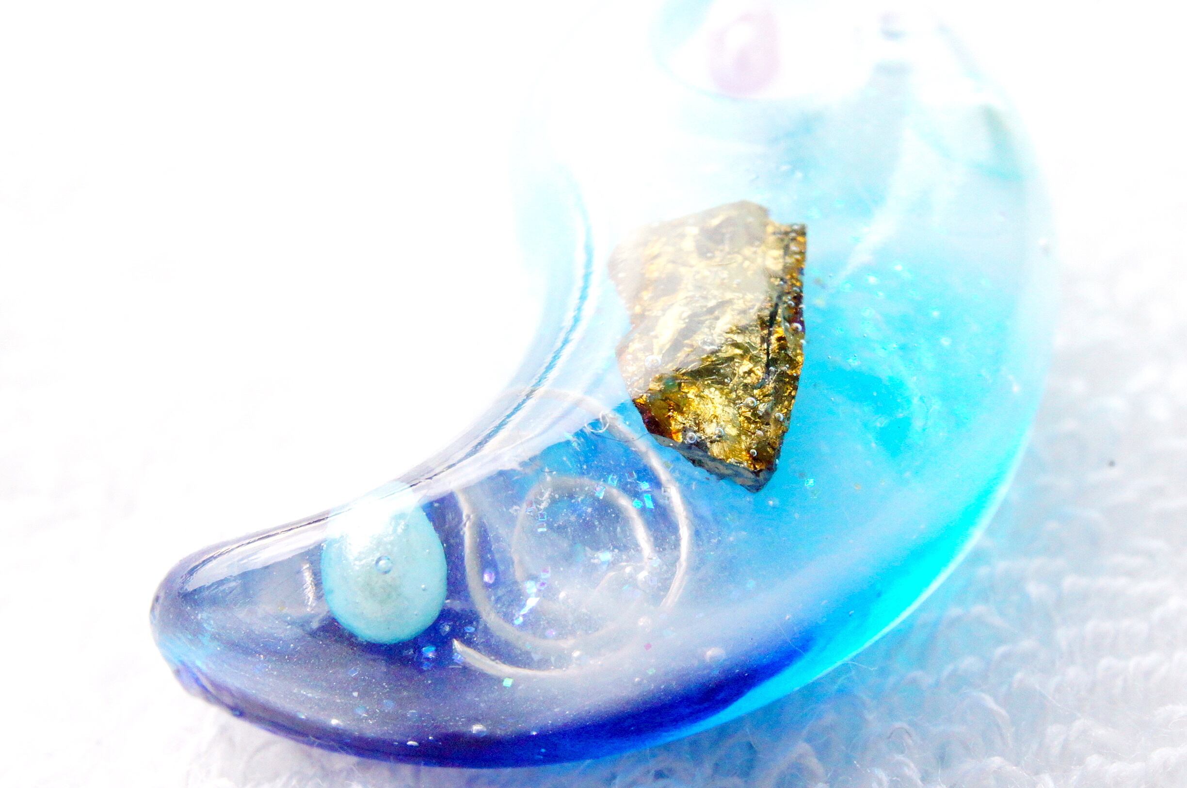 青く光る美しい海を勾玉で表現しました。